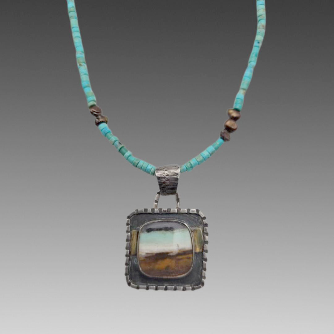 This handcrafted necklace features a striking opalwood cabochon, bezel set in blackened sterling silver and highlighted with rich 22k gold bimetal accents. The stone’s natural striations and desert-inspired colors are beautifully framed by the textured silver setting. The pendant measures 1½" square, making it a bold and eye-catching focal piece.