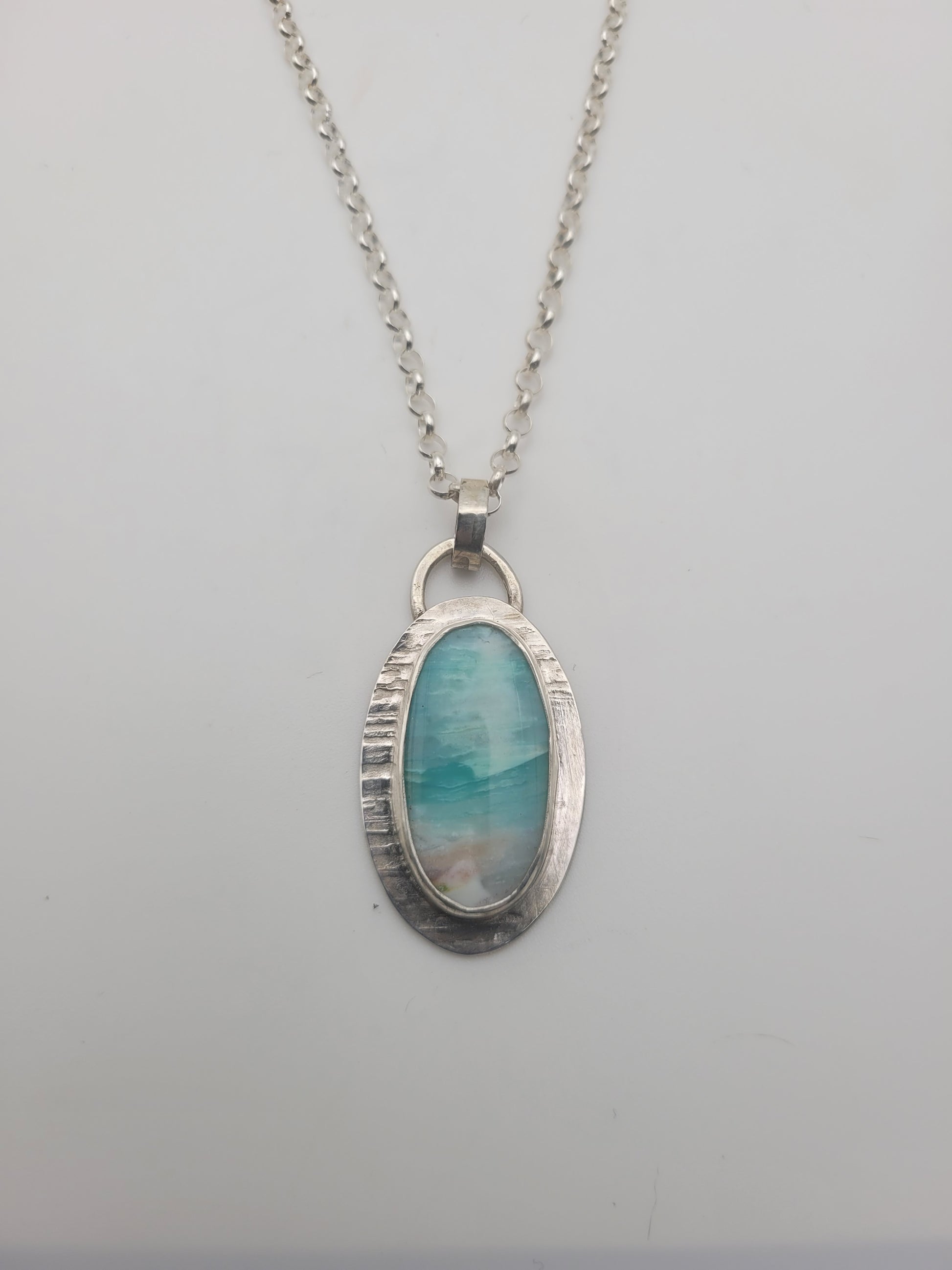 This handcrafted necklace features an oval Opalwood cabochon set in textured sterling silver. The stone’s natural bands of aqua, cream, and soft white evoke a serene sandy shoreline with gentle ocean waves and drifting clouds.