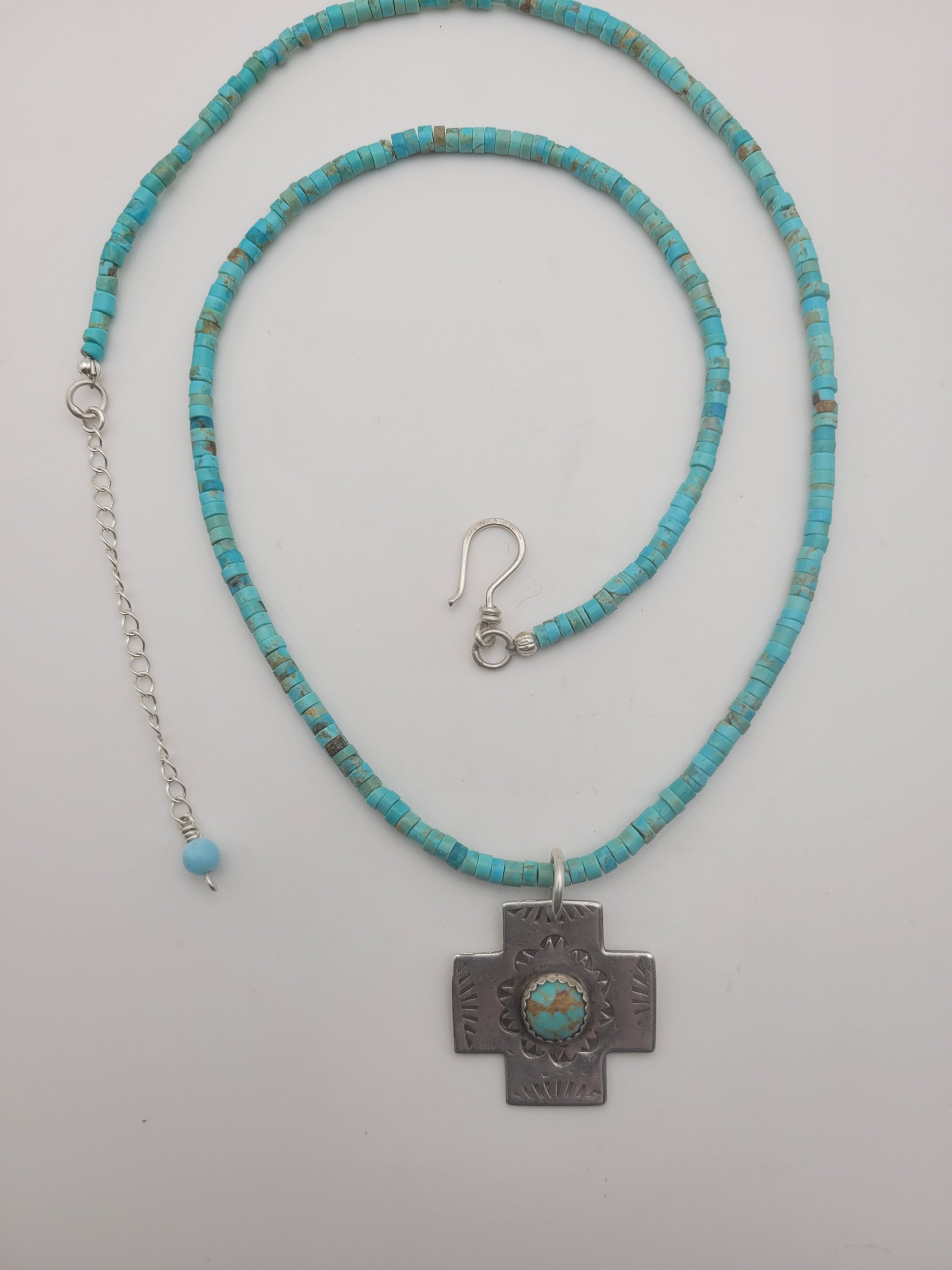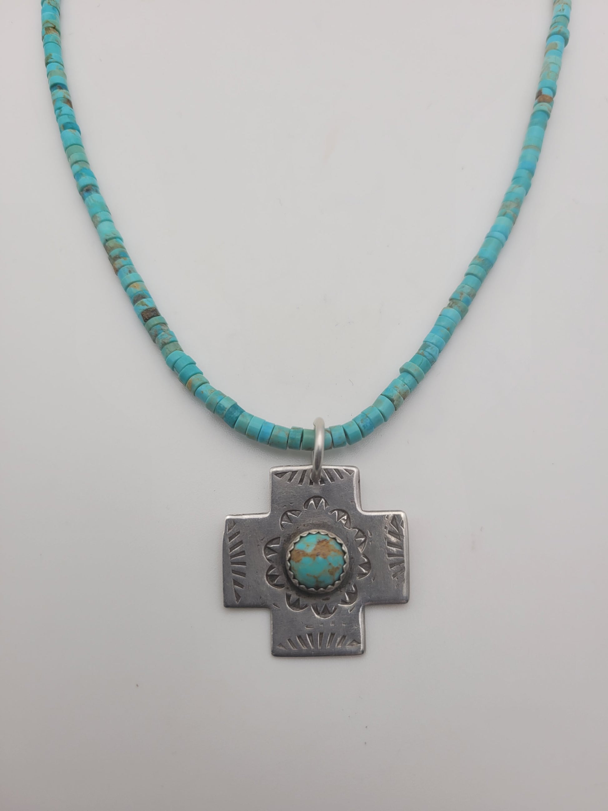 Kingman Turquoise Cross Pendant on Turquoise Heishi Strand